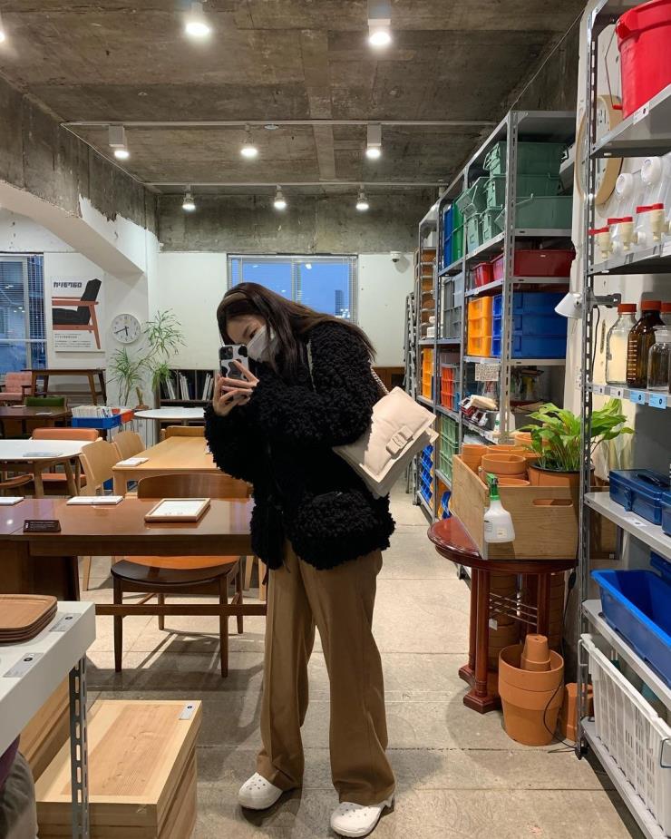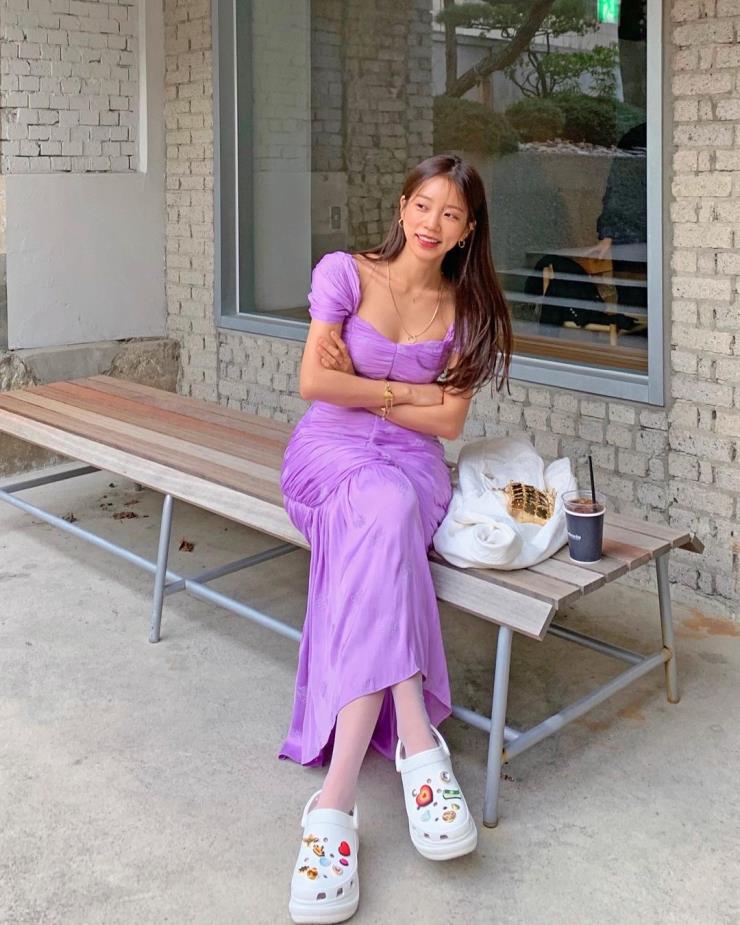사복 패션 강자 슬기는 화이트 크록스로 룩에 포인트를 주었다. 슬기처럼 슬랙스에 크록스를 매치하면 귀여운 믹스매치를 할 수 있다.