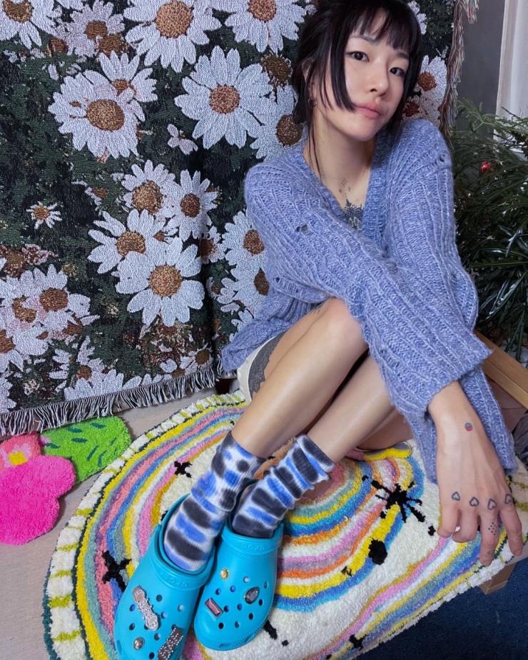 타투이스트 미래(@rrrrro_o)의 픽은 시원한 블루컬러 크록스! 같이 매치한 타이 다이 삭스가 룩을 더 힙하게 만들어준다. 크록스는 양말에 따라 색다른 느낌을 연출할 수 있다.