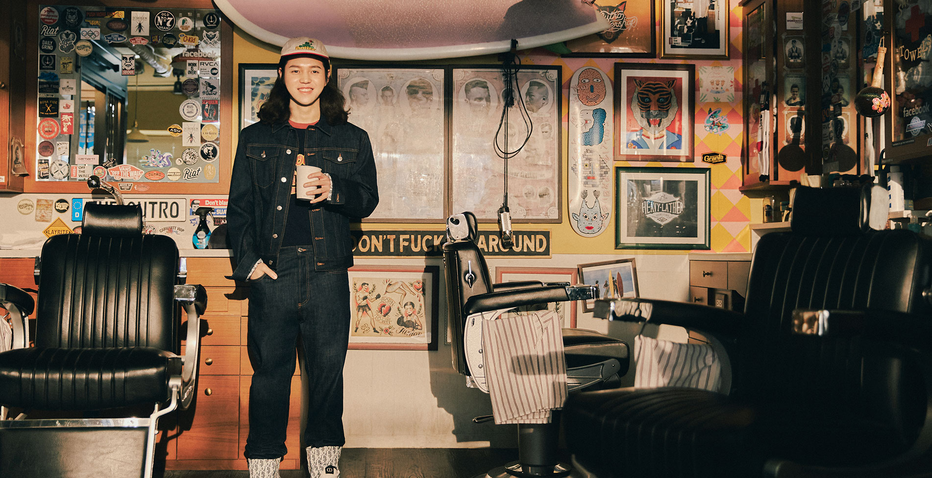 데님 재킷, 데님 팬츠, 스니커즈 모두 가격미정 디올 맨. 티셔츠 4만원대 가인드. 모자 가격미정 버터 by 라이엇.