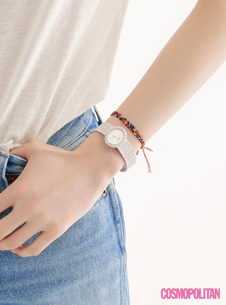 우아한 주얼 워치에 비즈 팔찌와 같은 캐주얼한 패션 주얼리를 레이어링해 쿨한 터치를 더하라.