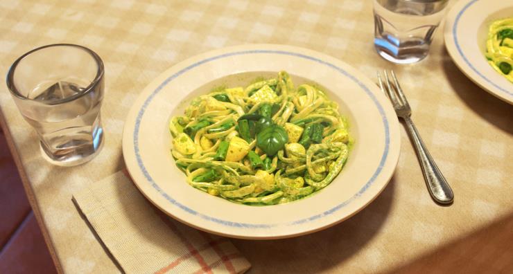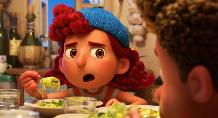 <루카>의 제작진은 리비에라 마을을 더 생생하게 담아내기 위해 엔리코 카사로사 감독의 집을 실제로 방문해 감독의 부모님과 함께 저녁을 즐기기도 했다는데요. 직접 이탈리아 현지의 음식을 경험해 더욱 생생하게 담아내기 위한 노력이었죠. 이러한 세심한 작업을 통해 영화 속에도, 극강의 군침을 유발하는 음식 비주얼을 재현했습니다. 영화 속에서 루카는 친구 줄리아의 집에서 ‘트레네테’라는 파스타를 처음으로 맛보고 감탄하는 장면이 등장하는데요. 트레네테는 우리에게는 조금 생소한 파스타이지만, 리비에라 지역의 특산물 중 하나로 마을 사람들이 즐겨찾는 음식이라고 하네요.