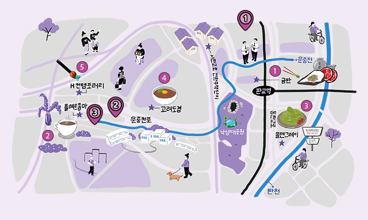 “날씨가 좋으면 운중천 따라 낙생대공원을 지나 봇들저류지공원까지 자전거를 타요. 걷고 싶을 때는 판교원마을 거리나 산운마을 쪽으로 가고요. 젊은 부부가 많이 살아서 그런지 어린아이나 반려동물에 호의적인 곳이 많아 마음이 편하달까요?” -판교 주민