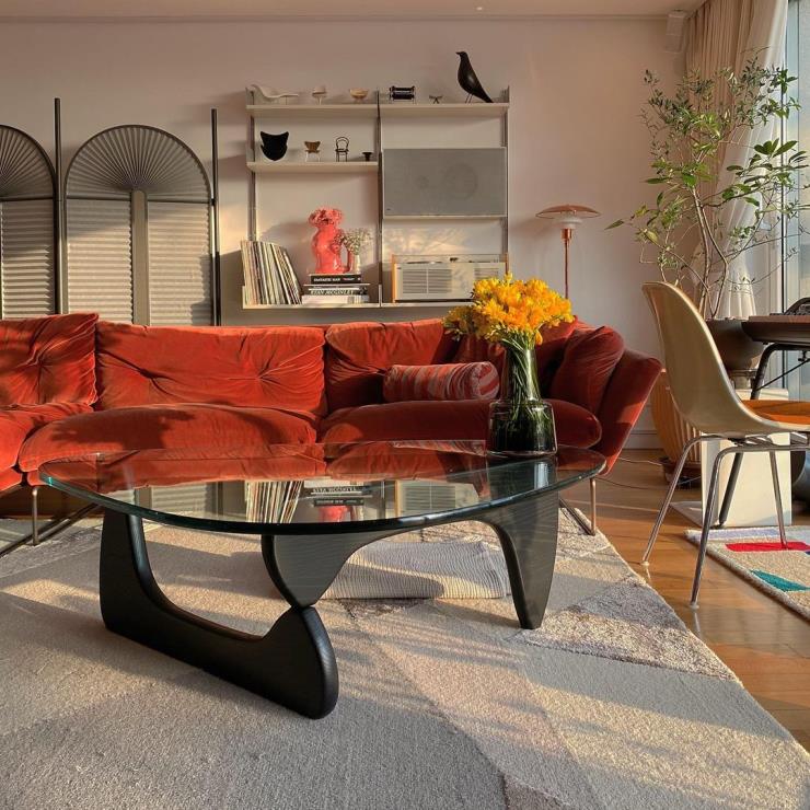 강민경의 반려견, ‘휴지’가 앉아 있는 의자는 인테리어에 관심 있는 누구나 하나쯤 소유하고 있을 법한 허먼 밀러의 ‘임스 체어’입니다. 미국 모더니즘의 창시자이자, 20세기의 가장 영향력 있는 디자이너인 찰스&레이 임스 부부가 디자인한 의자죠. 강민경이 구매한 임스 체어는 기존 임스 파이버글라스 체어와는 차별화된 제품으로 시트 부분에 오렌지 컬러의 패브릭이 결합된 ‘DSS Shell Chair’인데요. 모던한 인테리어 공간에 포인트 아이템으로 활용하기 좋은 제품입니다. 더불어 이 제품 역시 좌석과 등받이가 일체형인 셀 구조로 만들어진 것이 특징이며, 장시간 착석에도 편안함을 느낄 수 있습니다. 다양한 디자인과 컬러, 베이스가 있으며 국내 빈티지 임스 체어 편집숍인 오드플랫, 웨이브렛 등에서 구매 가능합니다.