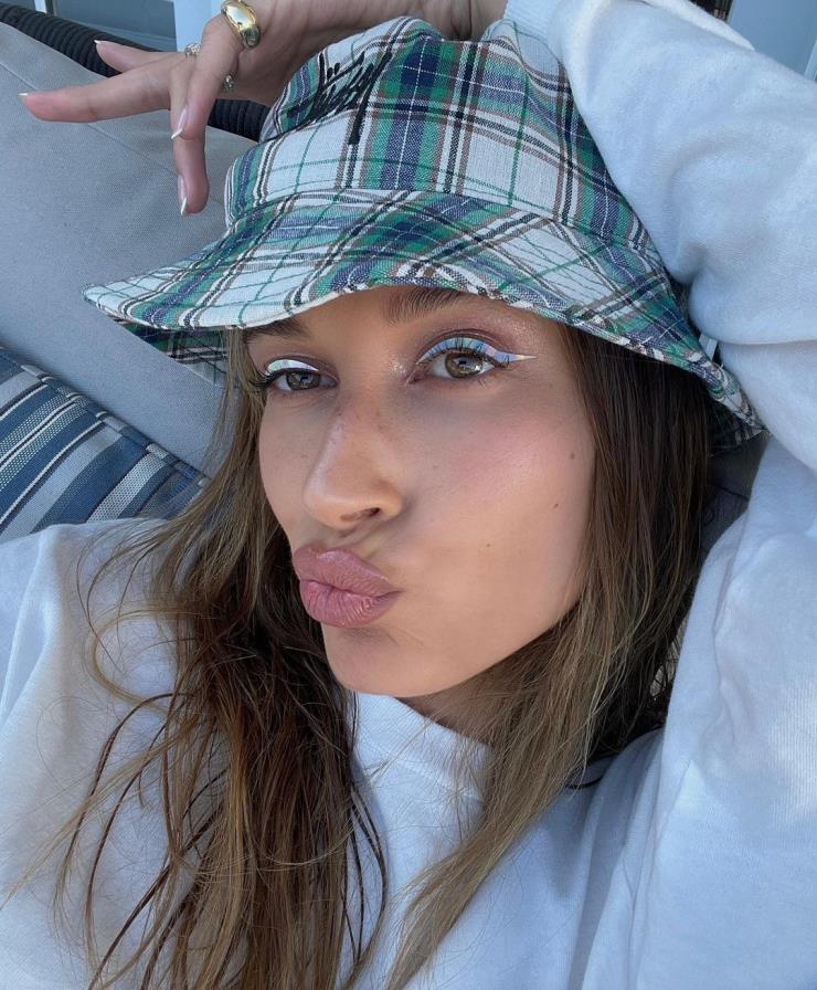평소 그녀는 팬들과 그녀의 팔로워들에게 맨얼굴을 하고 그녀의 자연스러운 생활을 공유하곤한다. 90년대 스타일에 푹 빠져있는 헤일리는 까맣게 그을린 피부와 반짝이는 아이라이너 스티커를 붙이고 미소짓고 있는 사진을 인스타그램에 공개했다. 독특한 아이라이너 스티커로 포인트를 준 유니크한 그녀만의 새로운 메이크업 스타일링과 빼놓을 수 없는 꾸안꾸 아이템 그녀의 버킷햇도.