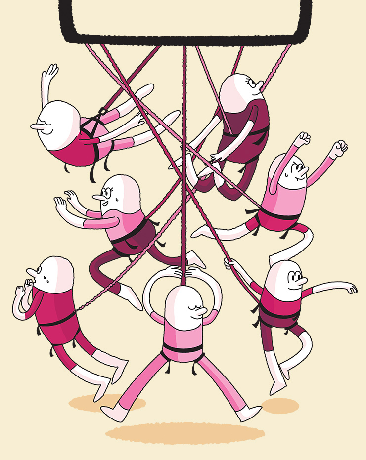 ④ 에디터 리뷰 하네스 착용은 생애 처음 경험하는 낯섦! 허벅지 안쪽(사타구니)이 심하게 조였고, 번지 코드를 연결하고 앉으라 하는데 허벅지에 힘이 들어가지 않으니 줄이 꿈쩍도 안 해 초반에는 목석처럼 서 있었다. 탄성이 조금 약한 코드에 다시 연결하고 나서야 허벅지에 힘을 주니 앉아지며 동작도 어느 정도 가능했다. 110bpm 빠르기의 팝 음악에 맞춰 동작을 수행하니 나중에는 흥이 돋아 몸이 저절로 움직여지더라. 운동이라는 생각은 정말 1도 들지 않았고 ‘신난다~ 재미난다~’는 생각만이 가득했다. 후반부에는 점프 동작을 경험했는데 스릴 만점! 마치 패러글라이딩에서 살짝 몸이 떴을 때의 짜릿함이 느껴졌다. 체험 수업이 끝나자마자 등록하고 왔을 정도니, ‘내 인생에 운동은 없어’라고 생각하는 운알못들이여 꼭 한번 경험해보길!
