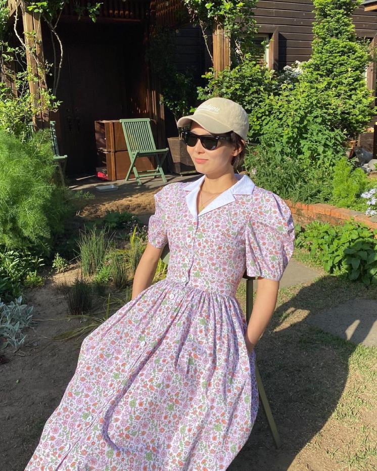 연보라 컬러의 미니 플라워 패턴 롱 원피스에 베이지 컬러의 볼캡을 스타일링한 김나영. 러블리한 플라워 패턴, 볼륨감 있는 퍼프 소매에 빅 카라까지 더해진 원피스를 픽해 발랄함을 더해주고 스포티한 선글라스로 멋까지 더해주었다.