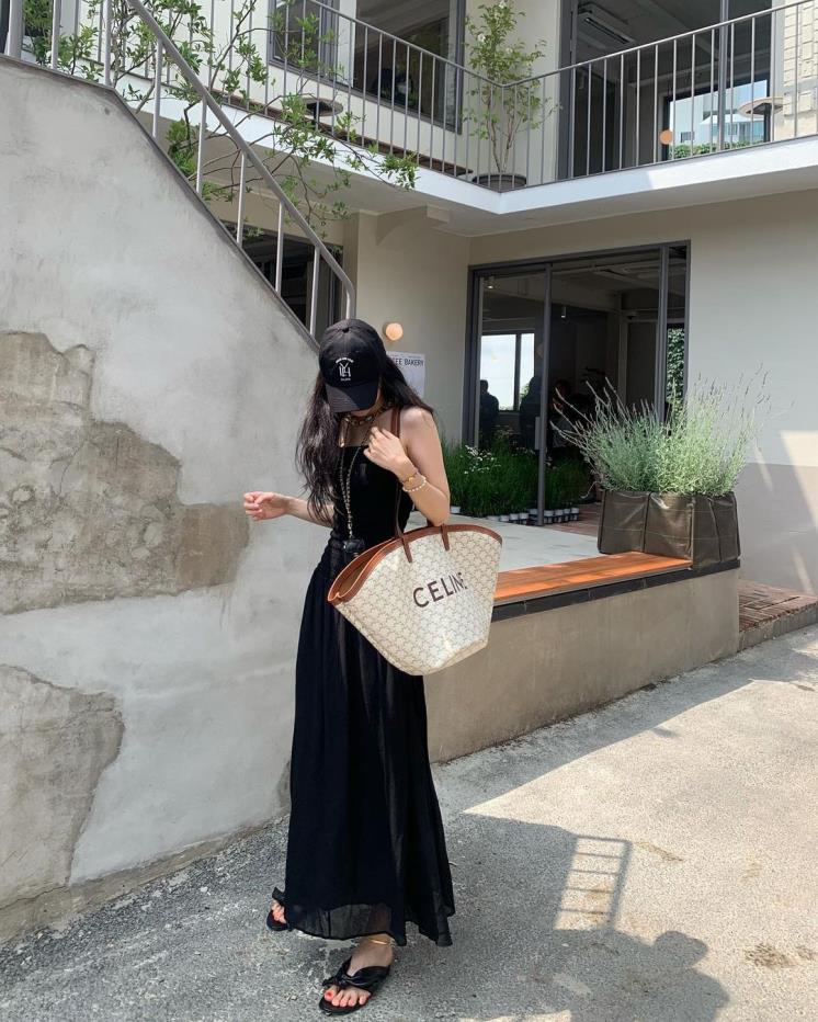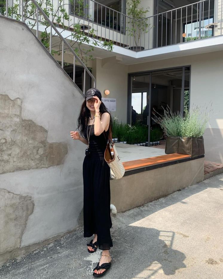 손나은은 슬리브리스 블랙 롱 원피스에 블랙 야구 모자와 블랙 샌들을 더해 올 블랙으로 시크한 매력을 보여주었다. 스목 주름 디테일과 물결치듯 떨어지는 밑단이 조화를 이루어 시원한 느낌의 원피스를 택해 올 블랙 코디임에도 불구하고 시원해 보이는 듯! 여기에 오버사이즈 쇼퍼백을 매치해 트렌디한 섬머룩을 연출했고, 컬러풀한 액세서리들로 포인트를 주었다