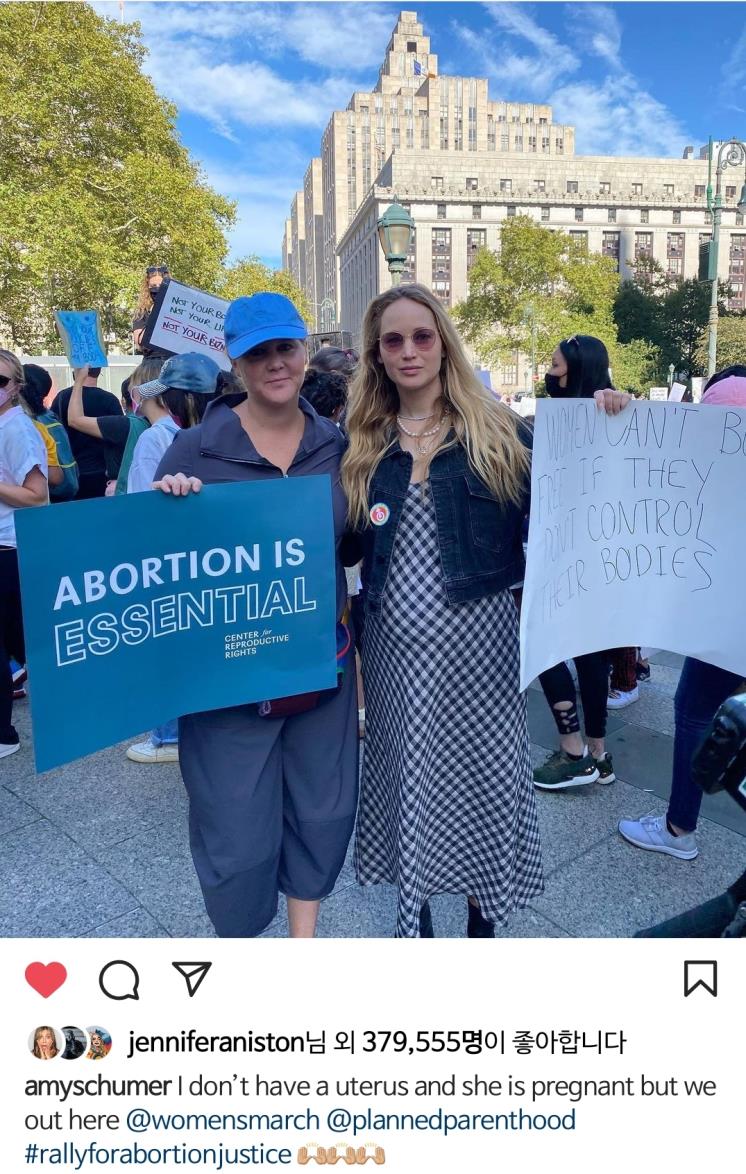 2019년 결혼 후 지난 달 첫 임신 소식이 전해진 제니퍼 로렌스. 며칠 전 그가 D라인을 드러낸 장소는 다름 아닌 '낙태 정의를 위한 집회'였다. "여성이 자신의 몸을 통제할 수 없다면 자유로울 수 없다(Women Can't Be Free If They Don't Control Their Bodies')" 팻말을 든 로렌스의 모습이 에이미 슈머의 인스타그램에 올라온 것. 슈머는 사진과 함께 "나는 자궁이 없고, 그녀(로렌스)는 임신 중이지만 그래도 우리는 여기에 나왔다'라고 썼다. 슈머는 최근에 자궁내막증으로 수술을 했다.