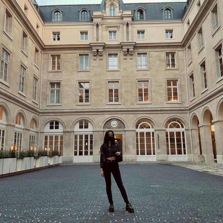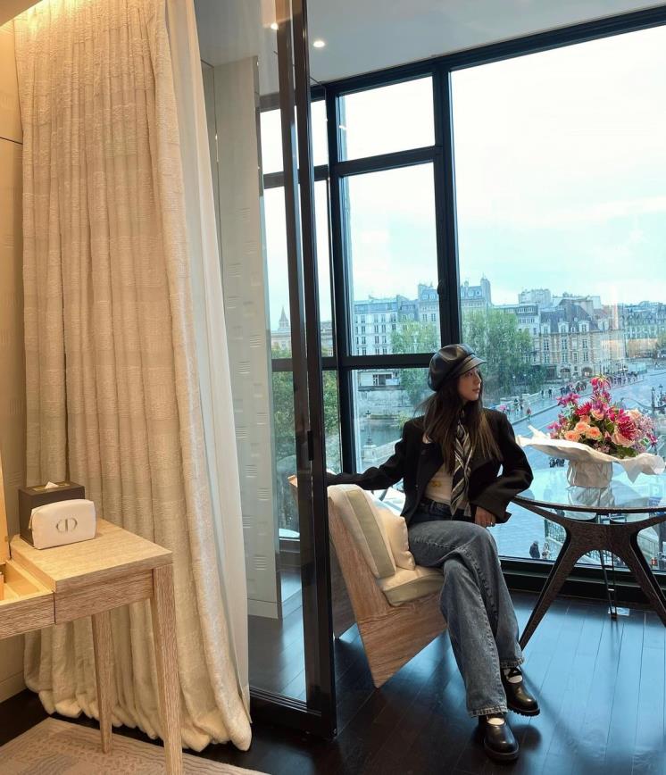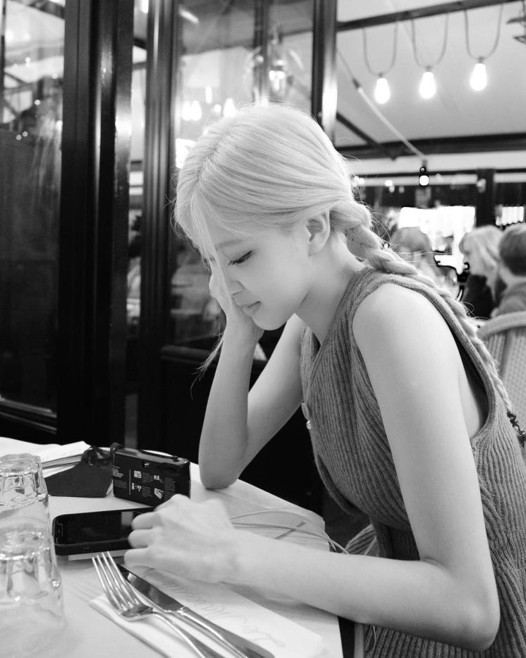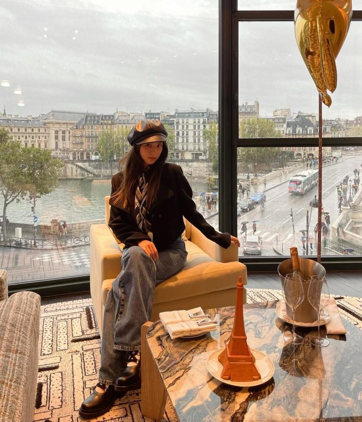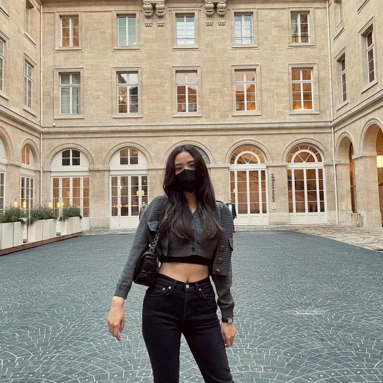 최근 각종 커뮤니티에서 Z세대가 피하는 아이템으로 스키니진이 거론된 바 있다. 지수가 파리에서 매치한 변형 슬림진이 어쩌면 M세대와 Z세대의 갈등에 평화의 화해책이 될 수도 있을 듯하다. 지수는 스키니한 실루엣의 슬림진을 착용했다.