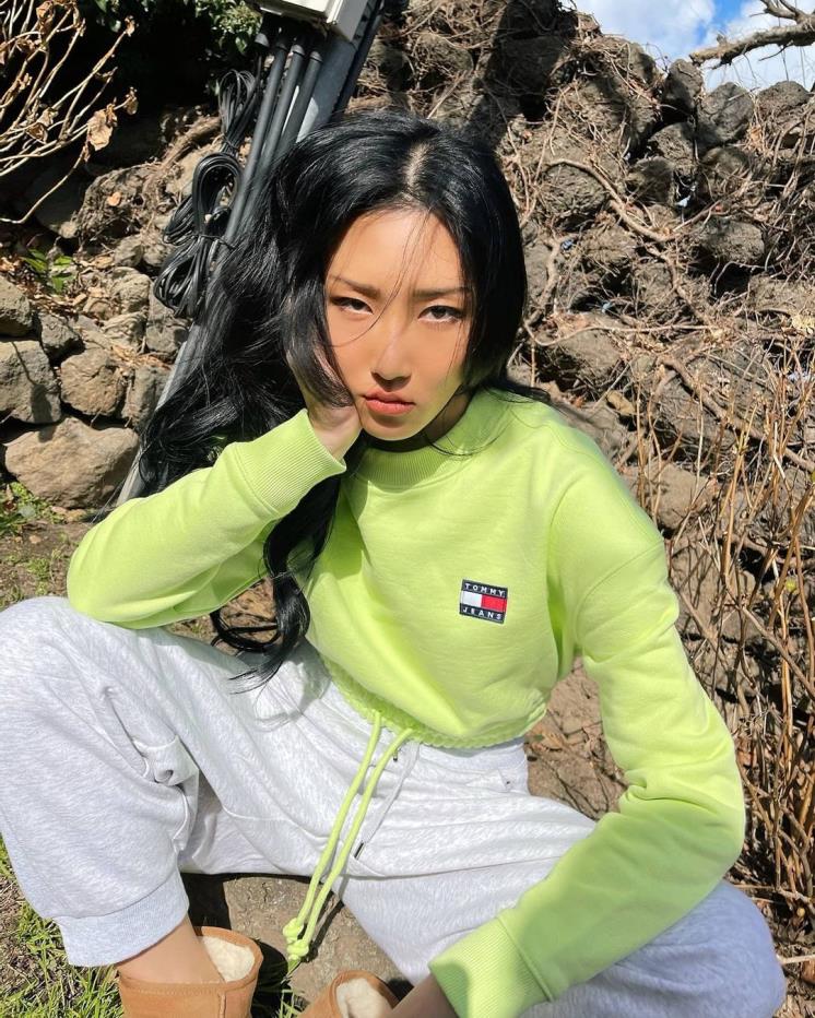 몇 시즌 째 이어지는 하이틴 트렌드는 추리닝에서도 이어진다. 화사는 크롭트 톱을 입어 배를 살짝 드러내 줬다. 과한 노출이 부담스럽다면 팬츠 또한 하이웨이스트로 매치한 화사의 팁을 얻어가자. 화사는 눈이 부신 네온 컬러로 선택해 개성을 야무지게 뽐냈다.