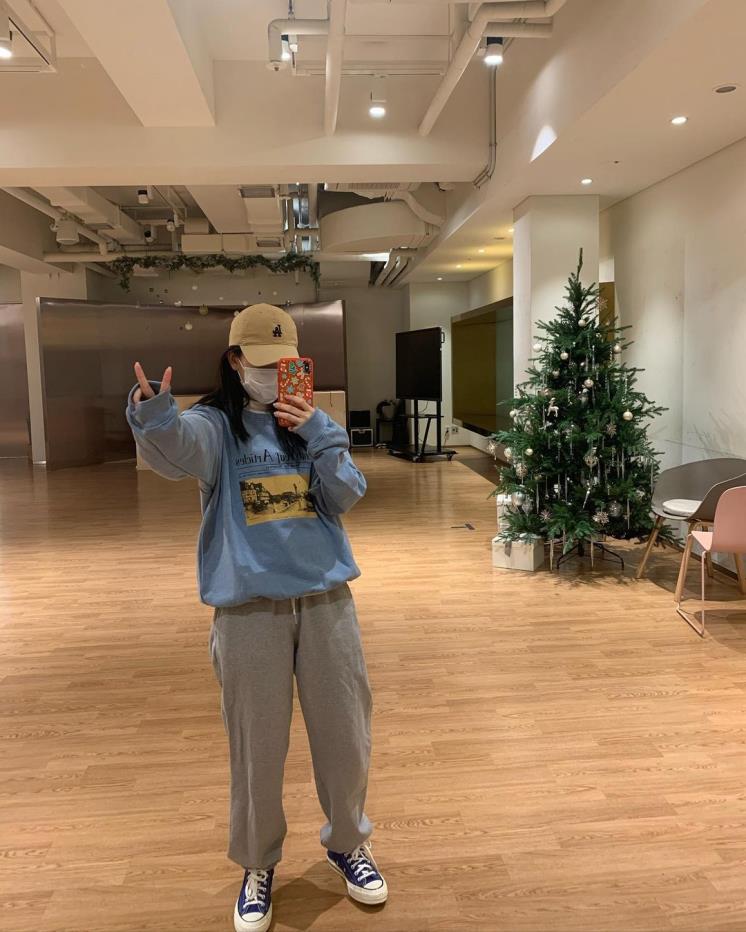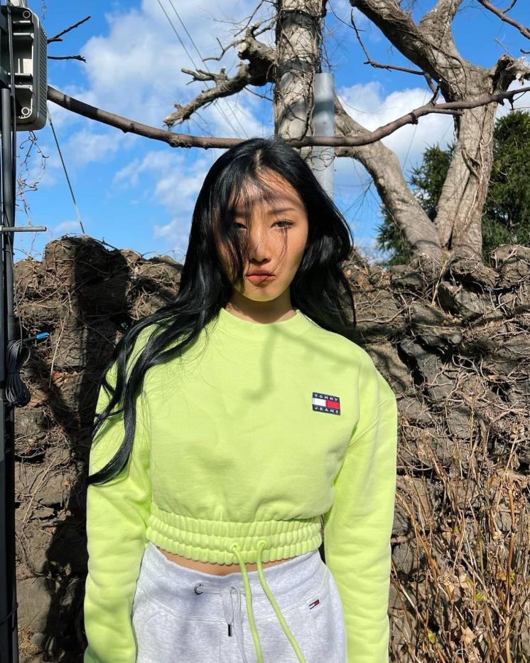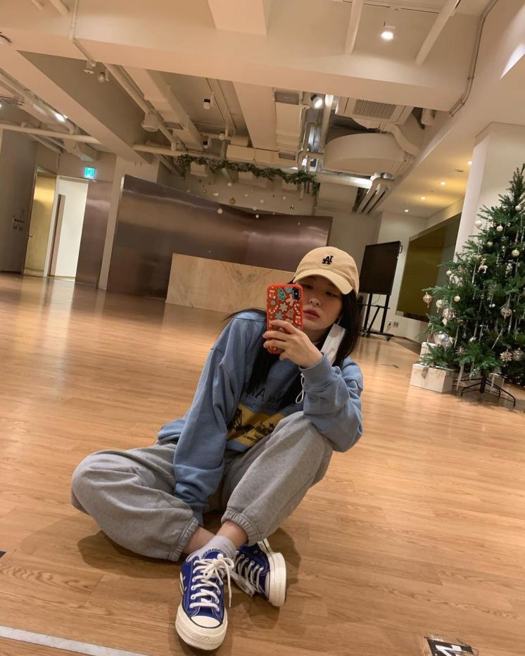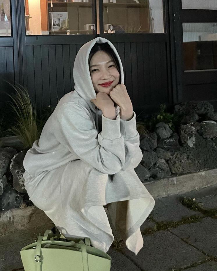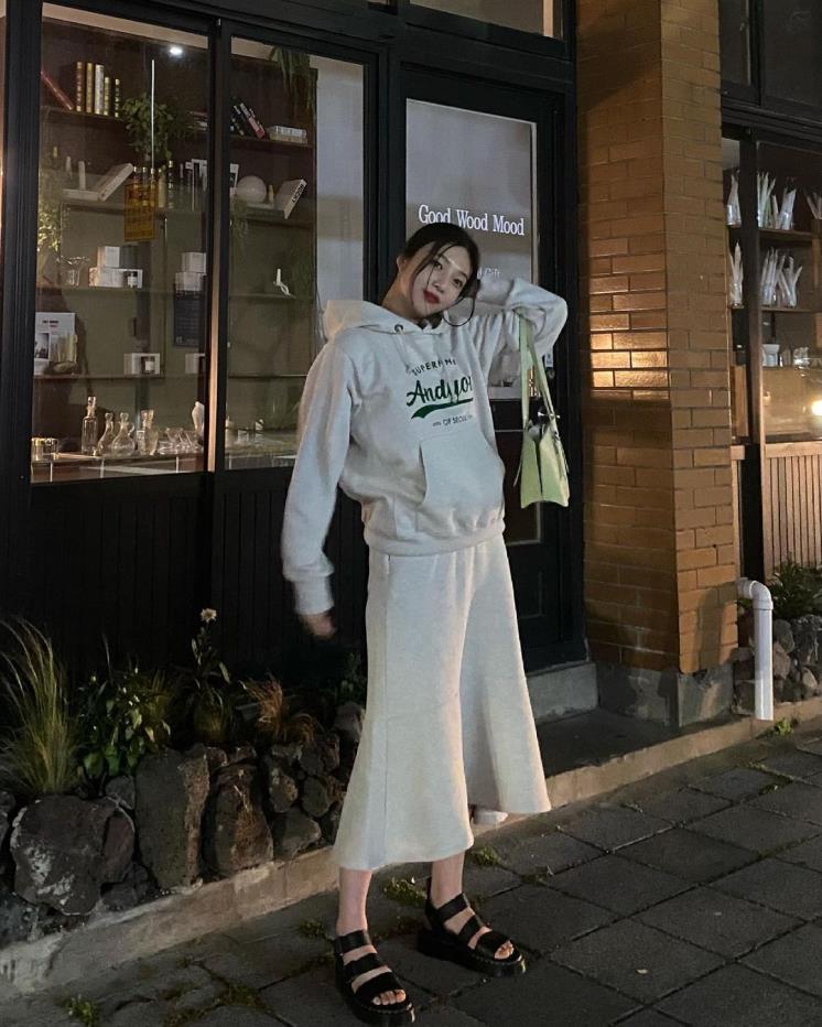 후디와 스커트 셋업으로 러블리한 룩을 완성한 조이. 그는 종아리까지 오는 기장의 롱스커트로 편안하면서도 발랄한 룩을 연출했다. 또 후디와 같은 소재인 스커트가 캐주얼한 매력을 지니고, 집 앞에 잠깐 외출한 듯 무심하게 툭 신은 샌듫 덕에 너무 꾸미지 않은 듯한 ‘꾸안꾸’ 룩이 완성됐다.