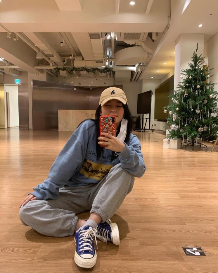 슬기는 스웨트셔츠와 조거팬츠, 볼 캡으로 전형적인 ‘추리닝’ 룩을 선보였다. 그의 이 심플한 스타일링이 심심하지 않은 덕은 바로 컬러 플레이. 슬기는 룩 전체를 차분한 톤으로 통일했으나 볼 캡은 베이지, 톱은 블루, 팬츠는 그레이 등 컬러로 재치 있게 변주했다.