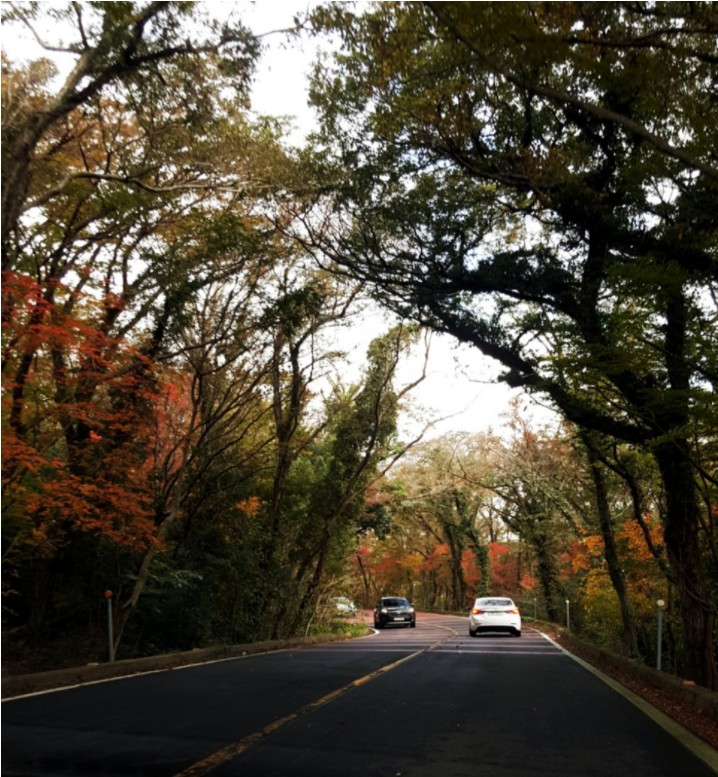 단풍 맛집은 제주도에도 있다. 5.16도로 숲 터널은 내비게이션에도 나오는 곳. 도로를 마치 나무가 감싸고 있는 것처럼 보여 숲 터널이라는 지명을 갖게 된 곳. 제주시에서 서귀포를 관통하는 도로로 한라산 가까이 있어 제주도의 원시림을 볼 수 있는 자연 맛집. 단풍이 절정에 오른 이 시기에는 숲 터널에 가기 전 특히 도로 갓길에 수많은 주차 차들을 볼 수 있을 정도로 많은 이들이 찾는 곳이라고.