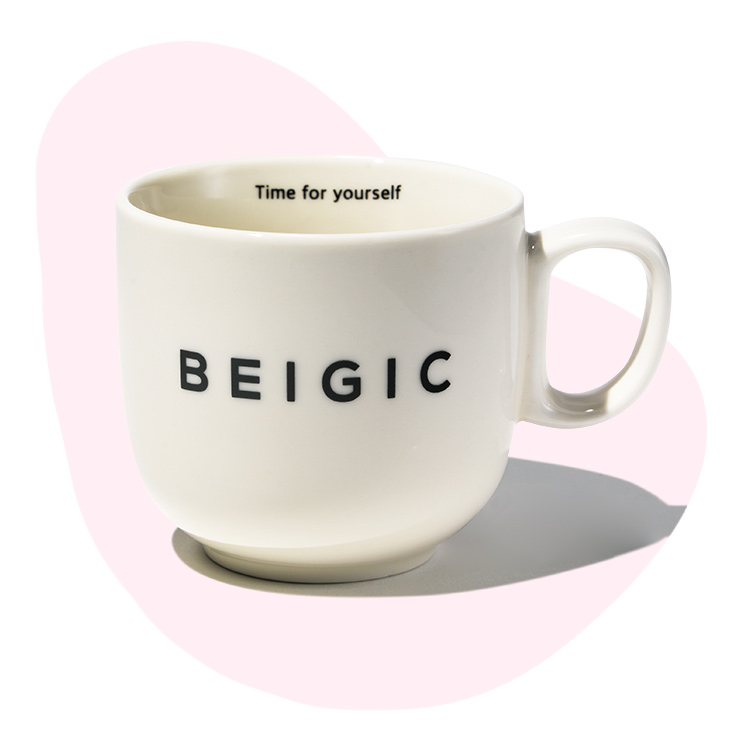 여기가 진정 뷰티 브랜드 맞나요? 여심 저격 뷰잘알 브랜드 베이지크는 브랜드 슬로건인 ‘Time for Yourself’를 모티브로 심플하고 따뜻한 무드의 소품을 선보이고 있다. 따뜻한 커피 한잔하면 여유로운 휴식 시간을 만들어줄 것만 같은 머그잔, 그리고 풍성한 볼륨감과 브랜드 시그너처 색인 샴페인 컬러로 스타일리시한 헤어 연출을 도와줄 스크런치 등 생활 속 잇템을 굿즈로 판매 중이다.