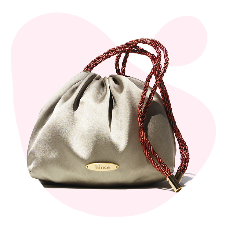코덕들 심쿵사 유발하는 컬러 맛집 뷰티 브랜드 힌스의 복조리st 미니 백 굿즈. 오묘한 옥색 컬러의 차르르한 새틴 원단과 우아한 셔링 디테일이 뷰티 브랜드의 제품이라고는 느껴지지 않을 만큼 만듦새가 탄탄하다. 2가지 타입의 끈으로 파우치부터 미니 백, 크로스 백 등 무드에 따라 다양한 연출이 가능하다.
