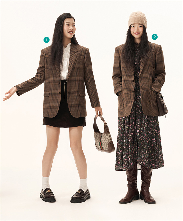 매니시한 체크 재킷을 스커트와 믹스하는 것 또한 좋다. 재킷과 동일한 소재인 울 또는 코듀로이·레더·코튼 소재가 좋겠다. 미니스커트로 프레피 룩을 완성하거나, 이번 시즌 트렌드의 정점에 있는 플리츠스커트 또는 면이나 울 소재의 미디스커트로 레이디라이크 룩을 연출해보자.