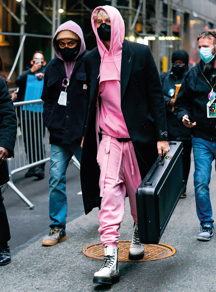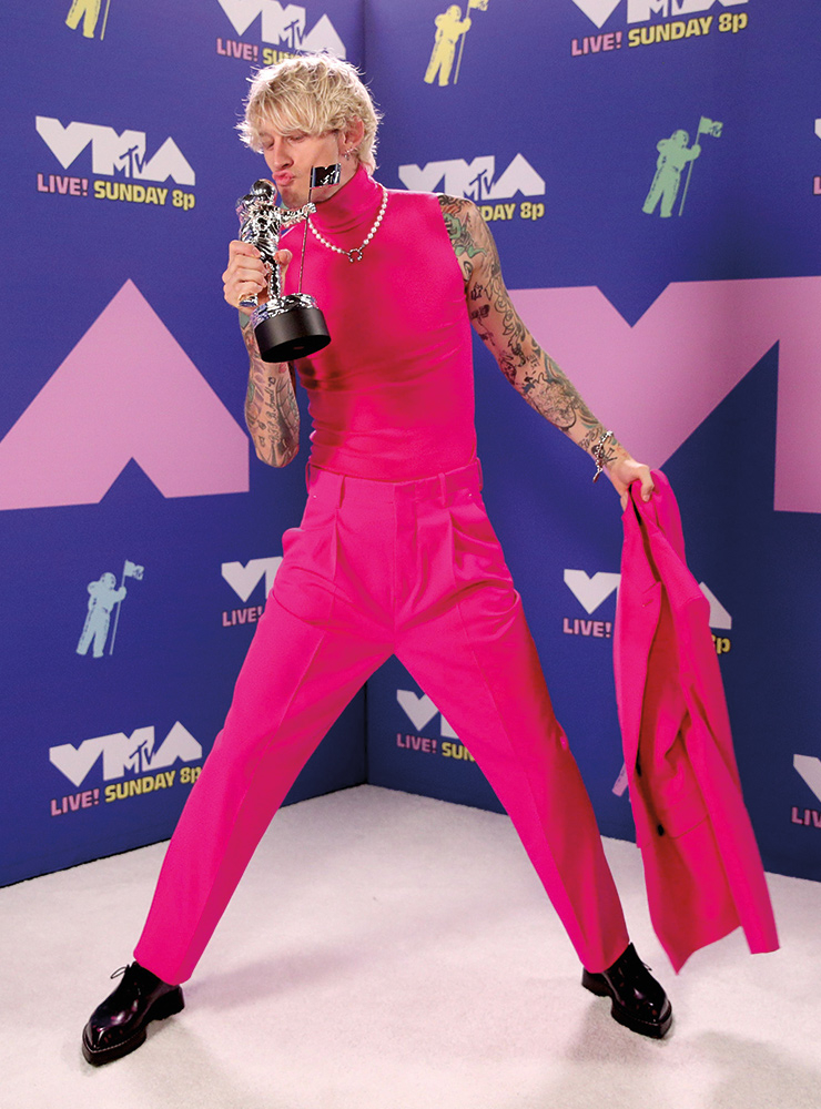 네일 브랜드를 론칭한 또 다른 핫 가이는 바로 머신 건 켈리. 한때 에미넴과 디스전을 벌이던 거친 래퍼이자 로커인 그의 옷장은 온통 핑크다. 타이다이, 후디, 슈트, 본디지 팬츠 등 핑크가 가진 러블리한 이미지를 마음대로 가공해 연출하는 것이 특기. 그가 선보이는 룩이 즐거운 건 고정된 이미지를 뒤집고 손상시키는 데서 오는 쾌감 때문이다. 핑크를 좋아하는 이유가 “극단의 논란을 유발하는 색이기 때문”이라며, “사람들은 ‘남자가 핑크 입는 게 싫다’고 하지만, 이런 감정을 불러일으키고 생각하게 만드는 것 자체가 예술”이라고 말하기도. Machine Gun Kelly: 고정관념의 전복
