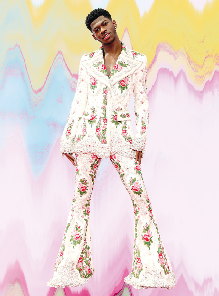 2019년, 릴 나스 엑스는 인스타그램을 통해 커밍아웃했다. 테스토스테론이 난무하는 힙합 신 한가운데서! ‘게이처럼 보이면 안 된다’는 강박을 벗자, 그의 판타지는 날개를 달고 현실 세계에 내려와 사람들을 놀라게 했다. 럭비 유니폼과 카우보이 슈트처럼 ‘남성적’인 옷을 핑크색으로 입거나, 테니스 스커트와 크롭 톱을 입고 무대에서 트월킹까지 췄다. 릴 나스 엑스는 진짜 자신을 표현하기로 한 순간부터 머릿속에 그려온 패션 세계를 용기 내 실현했다. 그렇게 그의 일상은 더 즐겁고 자신감 넘치는 순간이 됐다. LACMA 갈라 같은 패션 신에서도 그를 질주하게 하는 동력은 바로 이런 자유로움과 자기 긍정적 에너지다. Lil Nas X: 현실에 판타지 불러오기