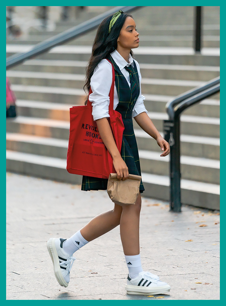 이 구역의 미친 년이자 스타일 워너비를 맡고 있는 퀸B, ‘블레어’. 아담한 체구에 사랑스러운 공주 같은 룩을 고수한 그가 가장 애정한 아이템은 바로 헤어 액세서리. 이 때문에 <가십걸>에선 각종 헤어밴드 스타일링을 무궁무진하게 감상할 수 있다. 한편 이를 오마주하듯 <가십걸 리부트>에선 ‘조야’가 첫 등교날 아디다스 운동화를 쿨하게 더한 스쿨 룩에 스카프를 헤어밴드처럼 연출했다.