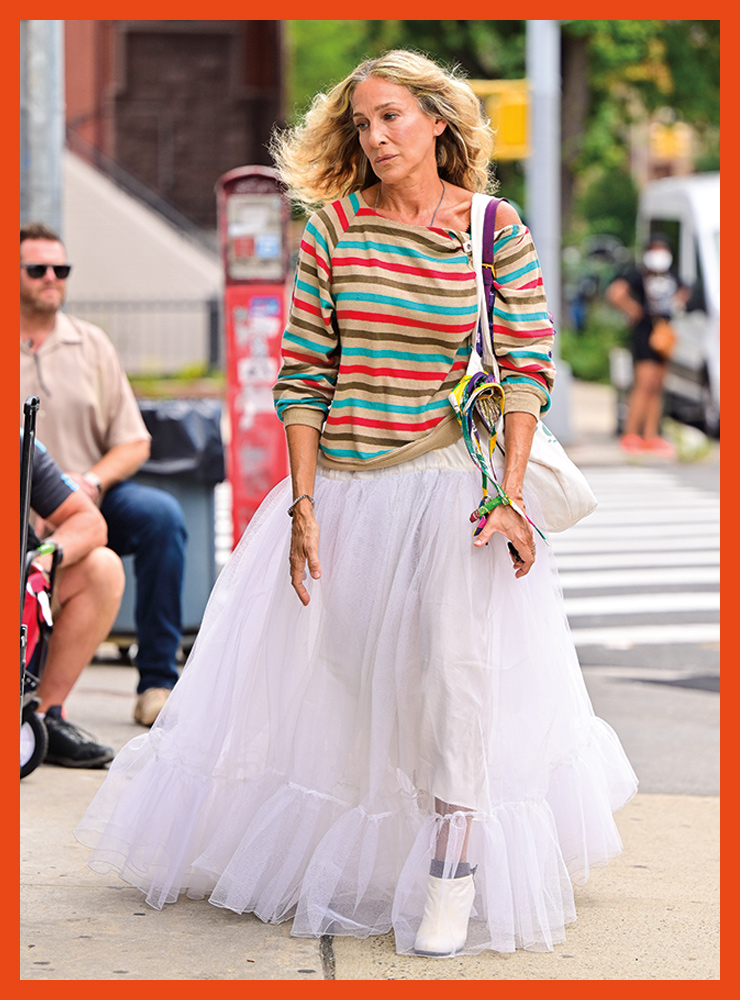 그 시절과 지금의 스타일을 비교하는 재미도 빼놓을 수 없다. <앤드 저스트 라이크 댓>은 2021년 12월 초 방영에 앞서 미리 공개된 일부 스틸 컷을 통해서만 짐작이 가능한데도 닮은꼴 스타일이 하나둘 발견됐다. 그중에서도 느슨한 스트라이프 니트 톱에 발끝까지 오는 기장의 튀튀 스커트를 입은 룩은 시즌 6에서 ‘캐리’가 파리로 건너가 보여준 로맨틱한 튀튀 스커트 룩이 떠오르는 스타일링이었다. 또한 베스트와 셔츠를 겹쳐 입은 룩 역시 과거 ‘캐리’ 스타일을 재해석한 룩! 심지어 2021년 버전의 도트 무늬 셔츠와 타이는 장 폴 고티에의 1997년 아카이브 컬렉션의 피스라고 하니 ‘패션 부심’을 뿜뿜 부리는 드라마의 위엄답다.