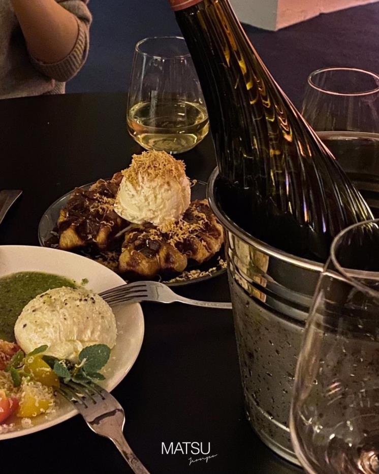 최근 몹시도 핫한 와인바, ‘마츠’. 합리적인 가격에 맛난 술과 음식을 즐길 수 있어 많은 이들의 최애 와인바로 등극한 ‘마츠’. 하지만 이게 전부는 아니다. 솔직히 분위기도 미쳤지 뭐. 달콤 상큼 ‘리코타 청포도’와 바닐라 아이스크림을 올린 ‘크로플’은 와인과의 합이 굉장히 좋은 편. ‘떼껄룩’ 급 퀄리티의 미친(?) 플레이리스트 들으며 와인 한 잔 하다 보면 괜히 아련해 지고 감성 폭발하고 그런 거 아니겠어요?