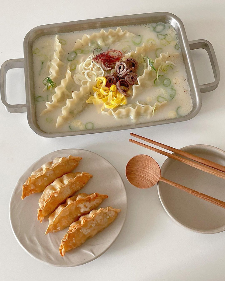 다음으로는 만두를 프라이팬에 노릇노릇하게 구웠다. 찐 만두도 충분히 맛있다고 생각했는데 프라이팬에 구우니 감칠맛이 더해져 더 맛있어졌다. 기름에 구웠는데도 느끼하지 않았고 바삭한 식감에 자꾸만 손이 갔다. 만두를 먹다 보니 떡국이나 샤부샤부 같은 국물 음식에 고기 만두 대신 넣어도 잘 어울리겠다는 생각이 들었다. 고기 육수에 고기 만두가 더해지면 음식이 자칫 느끼해질 수 있는데 플랜테이블 왕교자는 맛이 깔끔하기 때문이다.