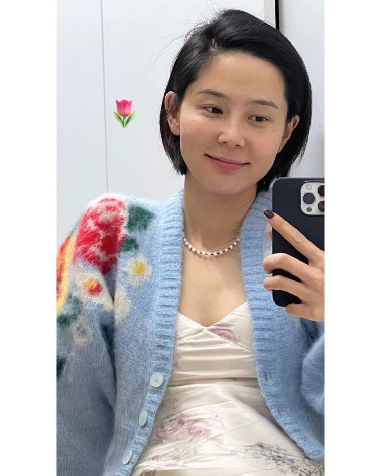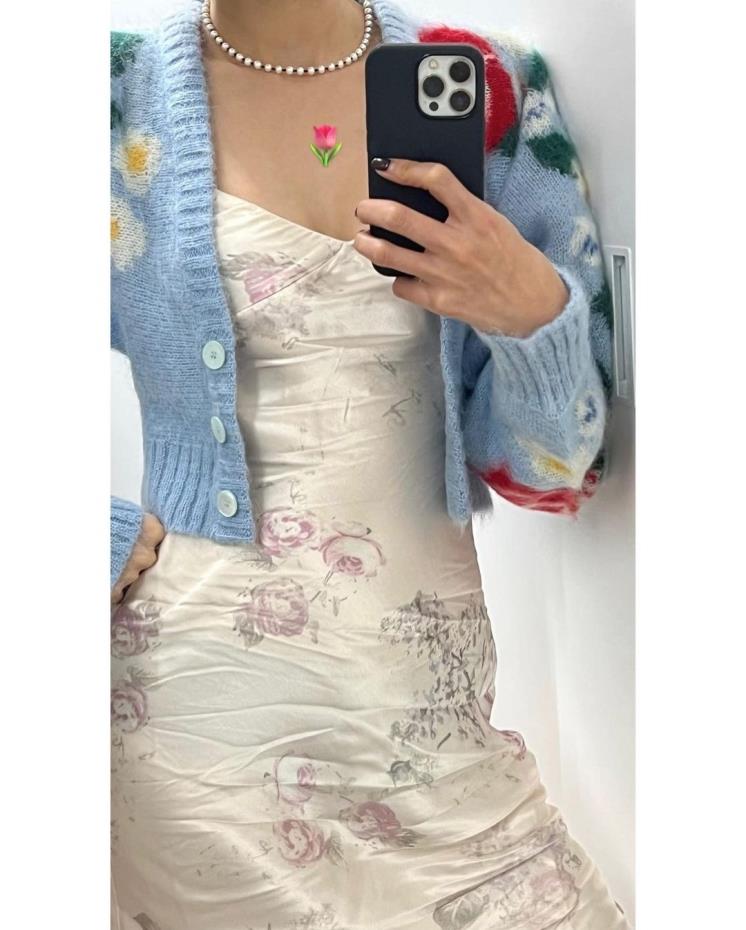봄만큼이나 화사한 플라워 패턴의 카디건과 원피스를 입은 김나영. 플라워+플라워로 한껏 화사한 룩에 진주 목걸이를 매치했다. 휑~해보이는 목을 꽉 채워주면서 은은하게 세련된 무드를 업해준다!