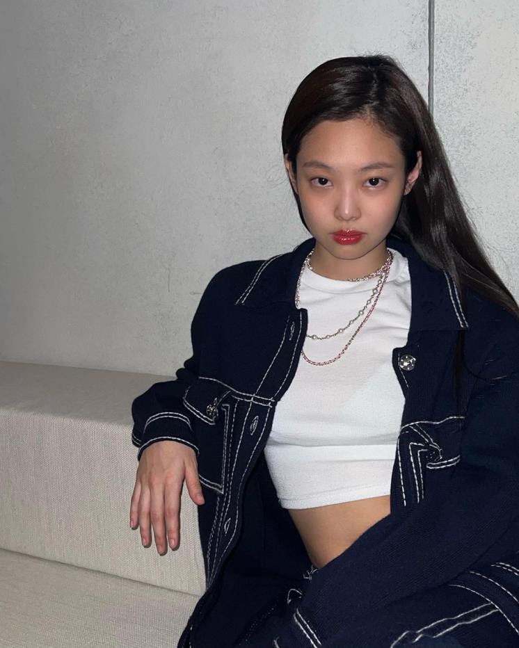 진주 목걸이를 힙하게 스타일링할 수 있나요? 당연히 쌉가능! 제니는 크롭티와 청청셋업에 진주 목걸이를 매치했다. 대신 또 다른 목걸이와 함께 레이어드해 진주는 우아하다는 공식을 완전히 탈피했다! 평소 가지고 있던 목걸이와 함께 레이어링 도전?