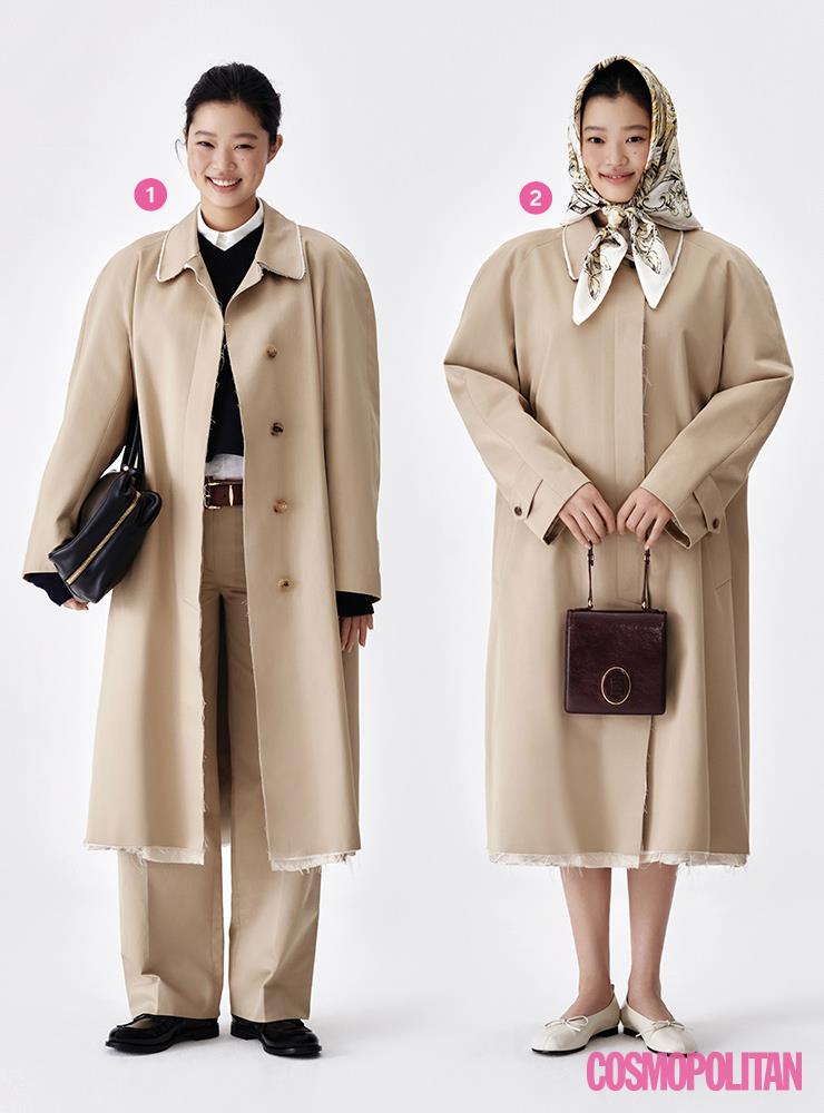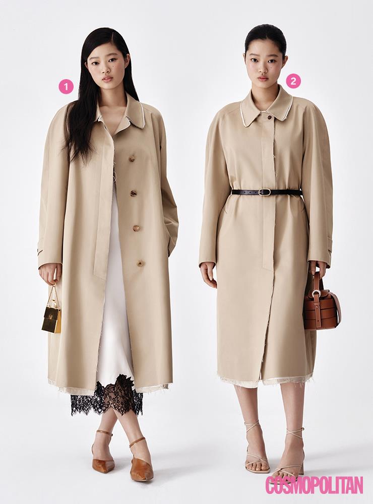 톤이 다른 2개의 트렌치코트를 겹쳐 입어, 구조적이며 드라마틱한 멋스러운 트렌치 룩을 완성하라. 옷장에 가지고 있는 트렌치코트로 구조적으로 변형된 디자인의 새로운 코트를 장만한 기분을 느낄 수 있을 것이다. 레이어드한 트렌치코트 1백48만원 위크엔드 막스마라. 셔츠 89만5천원 르메르. 슬랙스 20만원대 프랭키 샵 by 매치스패션. 클러치 2백90만원 로에베. 펌프스 13만8천원 레이첼콕스.