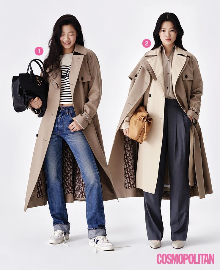 트렌치코트를 상징하는 패션 아이콘 제인 버킨의 스타일을 오마주한 드레싱. 고급진 토트백을 무심하게 드는 그녀의 쿨한 애티튜드도 반드시 기억하자. 트렌치코트를 캐주얼하게 즐길 땐 데님 팬츠만 한 것이 없다. 프렌치 시크를 상징하는 또 다른 아이템 스트라이프 톱과 스니커즈도 잊지 말것. 톱, 데님 팬츠 모두 가격미정 셀린느. 토트백 가격미정 살바토레 페라가모. 스니커즈 8만9천원 뉴발란스.