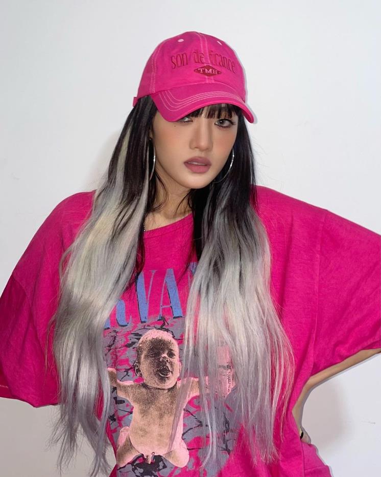 핫 핑크 컬러의 볼캡과 티셔츠로 깔맞춤 패션을 선보인 아이들 민니. 화이트 스티치가 큼직하게 들어가있는볼캡은 2000년대의 본더치를 떠오르게 한다. 여기에 효리 언니가 생각나는 왕 큰 링 귀고리로 Y2K 스러운 힙한 볼캡룩 완성!