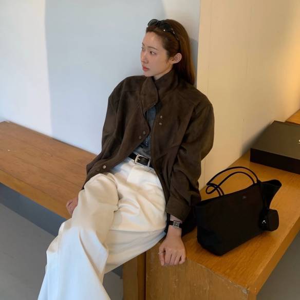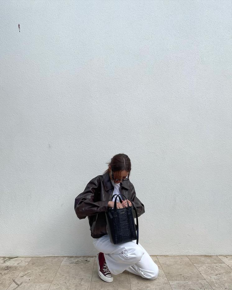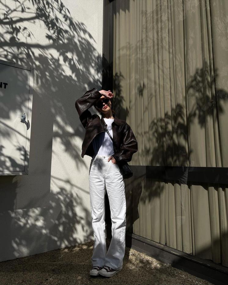 패션 유튜브도 운영하며 미니멀한 아이템을 활용해 아웃핏 아이디어를 소개하는 제스알리치. 놈코어 스타일 강자인 만큼 화이트 팬츠와 레더 재킷을 선택했다. 화이트 기본 티셔츠와 와이드 팬츠 그리고 브라운 레더 재킷을 매치했다. 또 버건디 컬러 컨버스 스니커즈로 브라운 레더 재킷과 은은한 통일감을 더했다.
