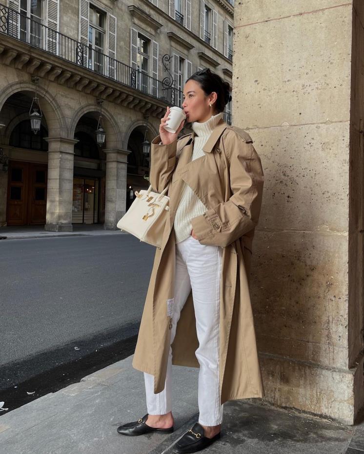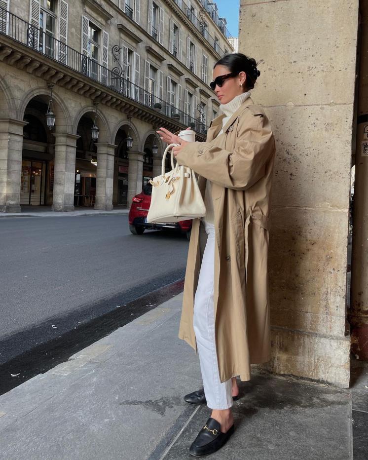 봄에 빼먹을 수 없는 트렌치코트도 화이트 팬츠와 찰떡궁합 아이템! 켈시메릿은 트렌치코트와 아이보리 터틀넥 그리고 화이트 팬츠를 매치해 파리지앵의 멋을 즐겼다. 또 파리지앵 느낌을 위해선 선글라스를 머리 위로 올려주는 것도 잊지 말자. 톤온톤 룩으로 편안한 감성을 가득 담은 스타일링인 만큼 부담 없이 시도해볼 만 하다.