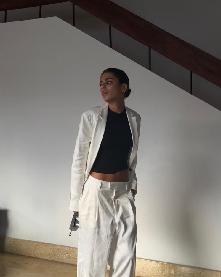 화이트 팬츠 스타일링 중 가장 먼저 들고 온 화이트 셋업 스타일링. 자라의 새로운 뮤즈? 자라 앱 쇼핑을 한 사람이라면 봤을 젠 체발로스. 셋업이 트렌드로 자리 잡은 만큼 그처럼 화이트 컬러의셋업을 선택해보자. 과하지 않은 심플한 크롭탑으로 깔끔함을 더욱 돋보이게 연출했다. 여기에 선글라스나 주얼리를 더해주면 더욱 센스 만점.