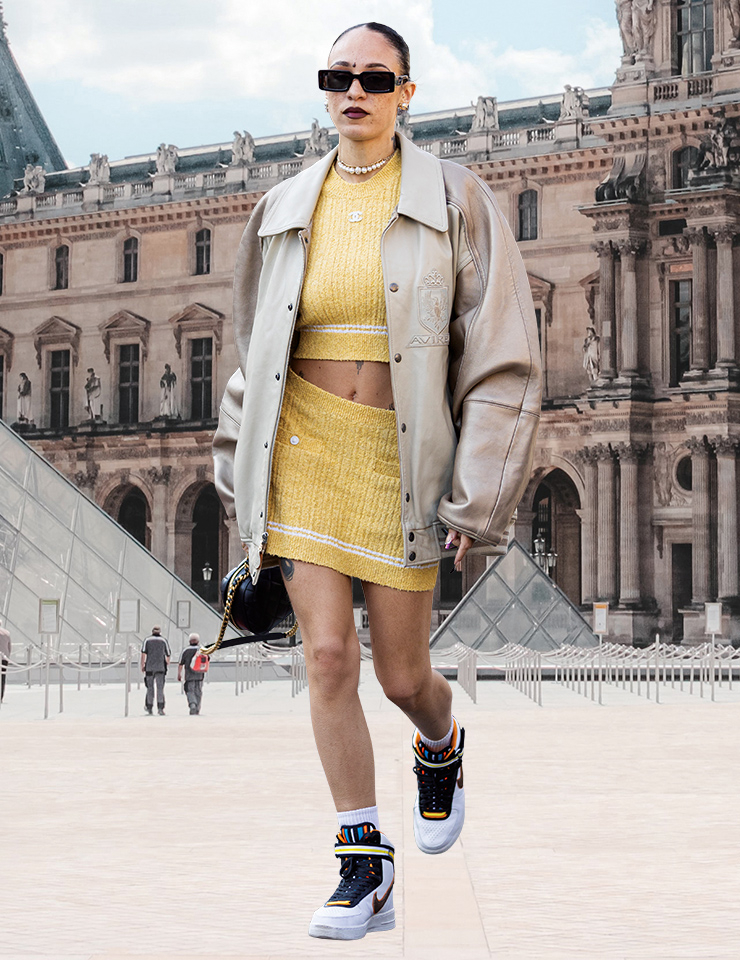 하이패션과 스트리트의 만남! 모델 겸 인플루언서 헤라 프라델은 샤넬 트위드 톱과 스커트에 박시한 봄버와 나이키 하이톱을 더해 쿨한 멋을 200% 살렸다. Hera Pradel