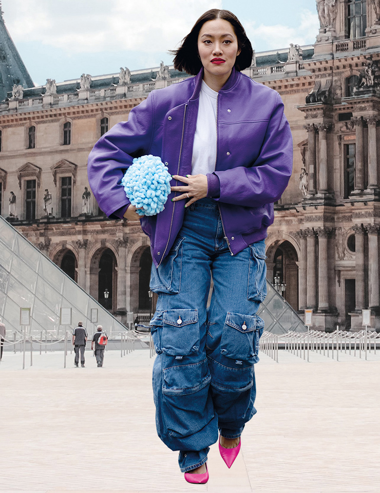 와일드한 봄버와 포켓 팬츠도 컬러를 다르게 선택하면 분위기가 달라진다. 티파니 휴는 퍼플 봄버에 파스텔컬러의 백을 더해 상큼함을 한 스푼 얹었다. Tiffany Hsu