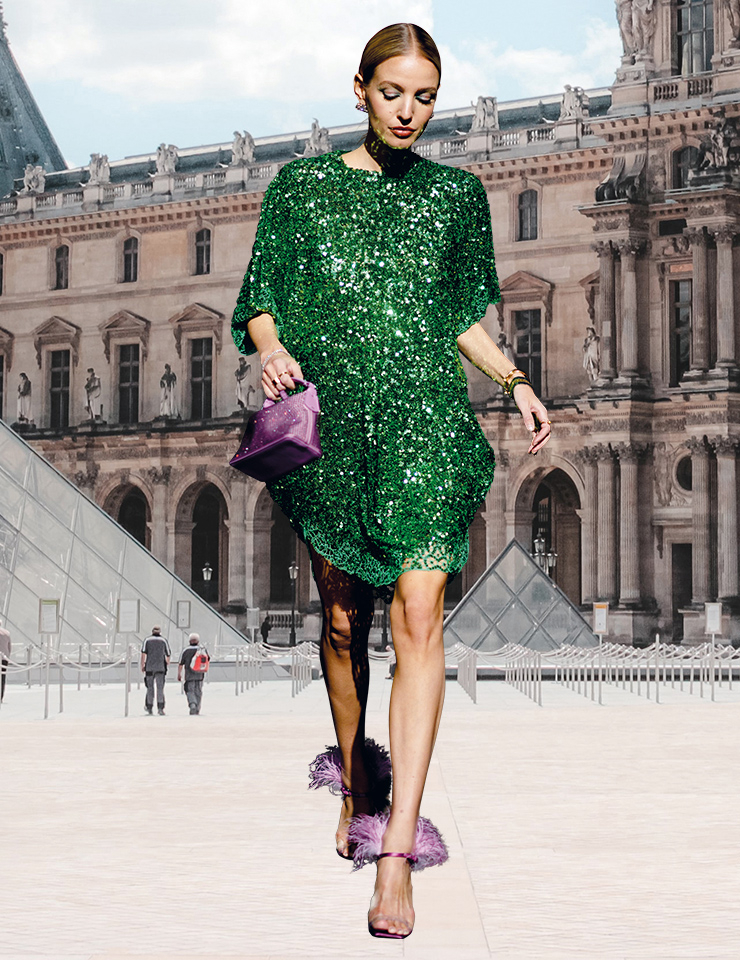 그린과 퍼플 컬러의 보색대비로 한층 더 화려한 룩을 완성한 레오니 한네. 이번 시즌 디자이너들 역시 드레스업하라고 권하니 비비드 컬러 스팽글 등을 활용해 봄 스타일링을 완성하면 어떨까? Leonie Hanne