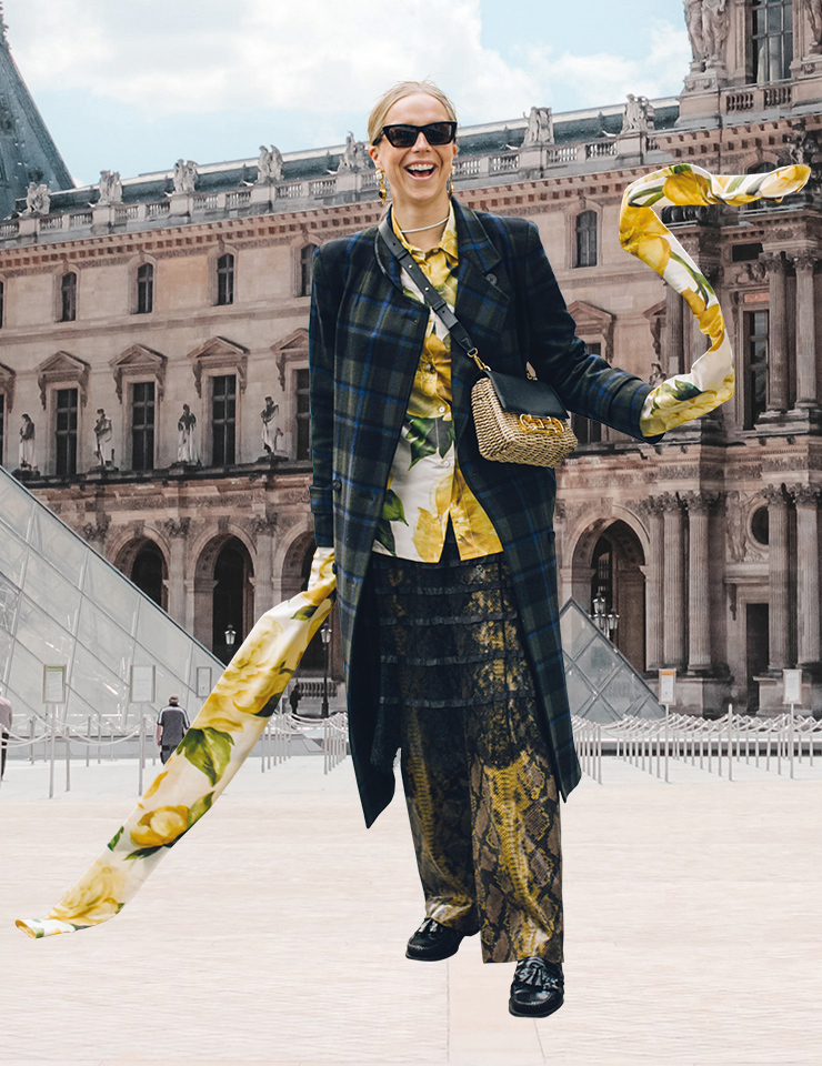 3가지 패턴을 조화롭게 믹스한 뉴욕의 콘텐츠 디렉터 클로에 킹. 전혀 다른 패턴과 프린트지만 눈에 거슬리지 않는 것은 비슷한 계열의 톤온톤 매치 덕분이다. Chloe King
