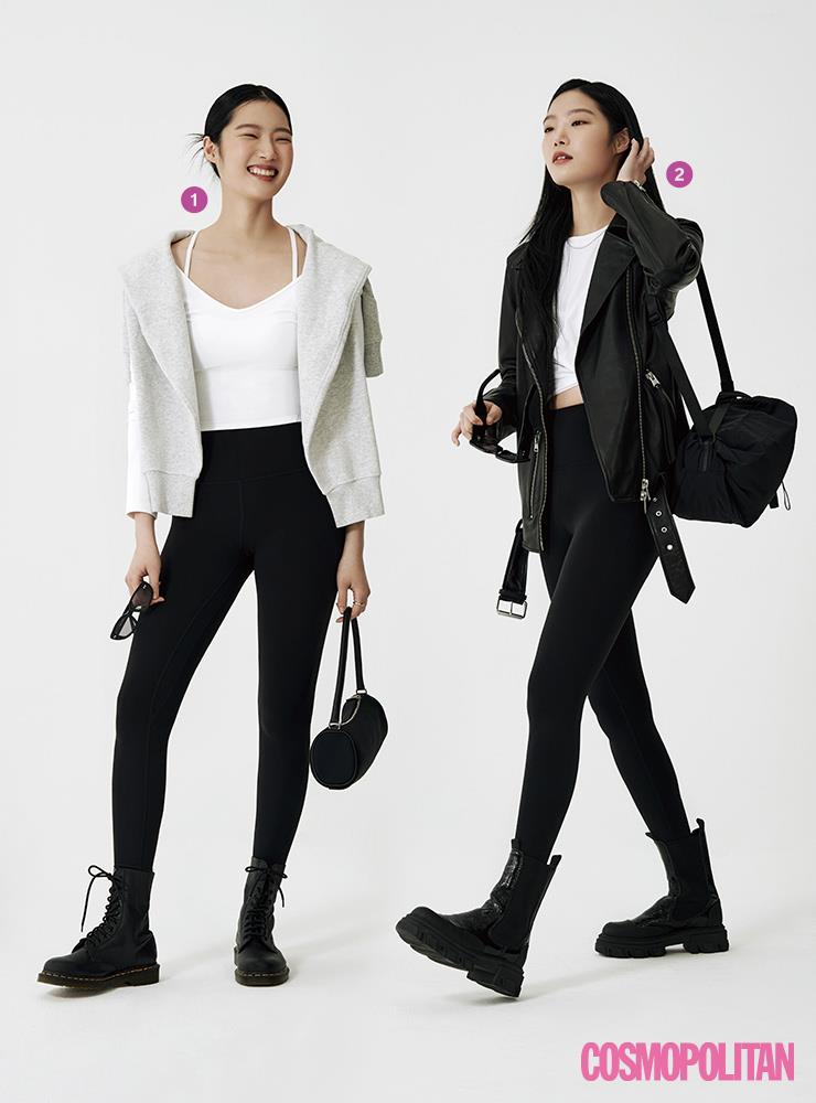 요가 팬츠가 이렇게 쿨해 보일 수 있다니! 모노톤 컬러의 요가 팬츠는 시크한 가죽 재킷과도 멋진 조화를 이룬다. 터프한 부츠와 선글라스, 툭 걸치기 좋은 백도 잊지 말자.
