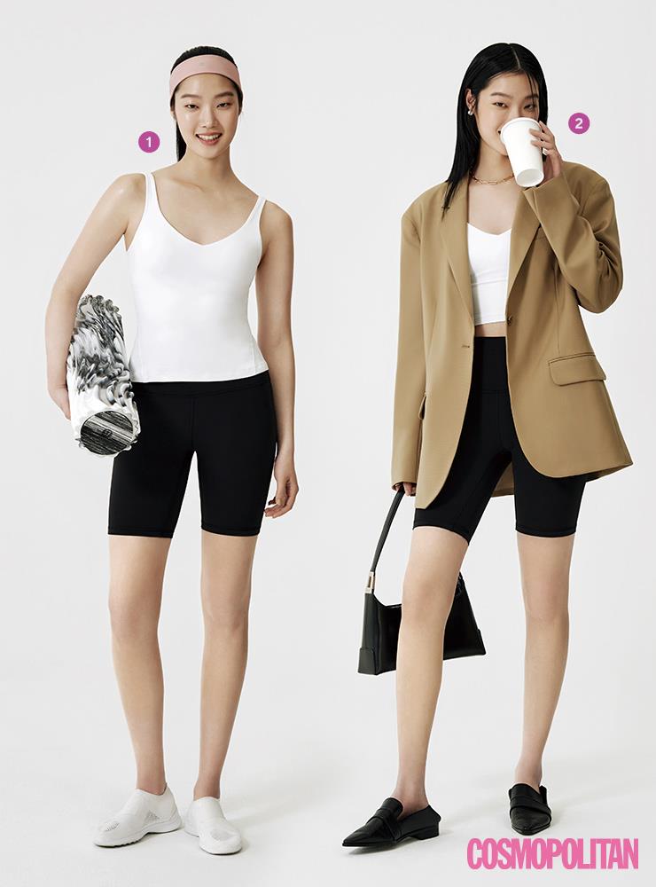 쇼츠 레깅스와 브라톱을 사무실에선 입을 수 없다는 편견을 버려라. 모던한 재킷과 백, 슈즈만 있다면 문제없다!