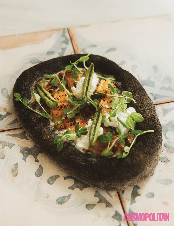 피자 같은 경우 유기농 밀가루에 흑마늘을 넣어 도우를 직접 만들고, 캐슈너트를 불려 만든 크림소스, 3일 동안 불린 아몬드 껍질을 까서 만든 리코타 치즈에 허브 청이 들어가요. 초당 옥수수를 토치해서 올리고, 비건 베이컨을 로스팅해 뿌리고, 완두순과 완두콩 칩에, 참나물 줄기를 버리지 않고 피클로 내죠. ‘피자 소금’이라는 소금 레시피도 따로 있어요. 다른 셰프들이 와서 먹어보더니 ‘피자’라고 하지 말라더군요. 이건 그냥 요리라고.