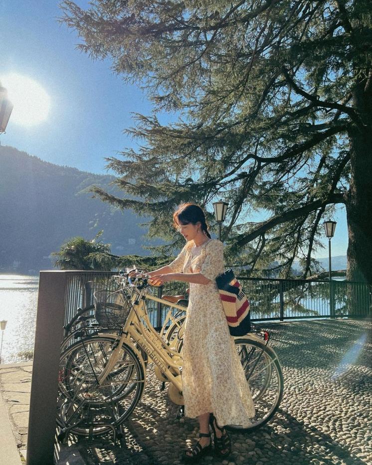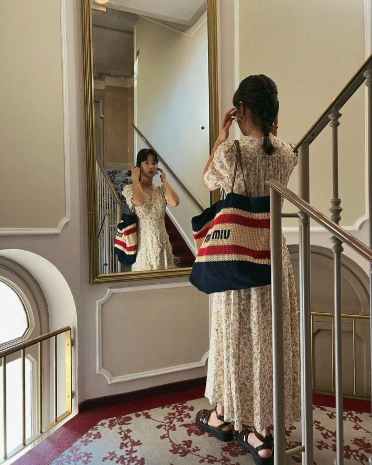 이탈리아에서 영화 같은 일상을 공개한 기은세. 랩 스타일의 브이넥 디자인과 볼륨감 있는 슬리브 디테일이 돋보이는 드레스와 니팅 백의 조화가 사랑스럽다. 빅 사이즈 니팅 백인 만큼 여행지에서 실용성까지 갑! 이번 여름 휴양지 룩으로 저장~.