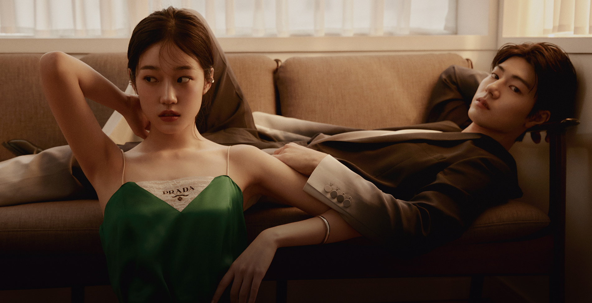 (노윤서)실크 롱 드레스, 벨트 모두 프라다. 이어 커프 위로젝트. 뱅글 셀뮤트. (배현성)세트업 김서룡 옴므.