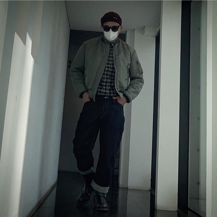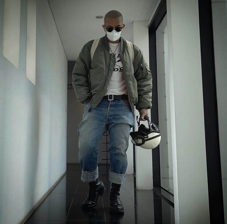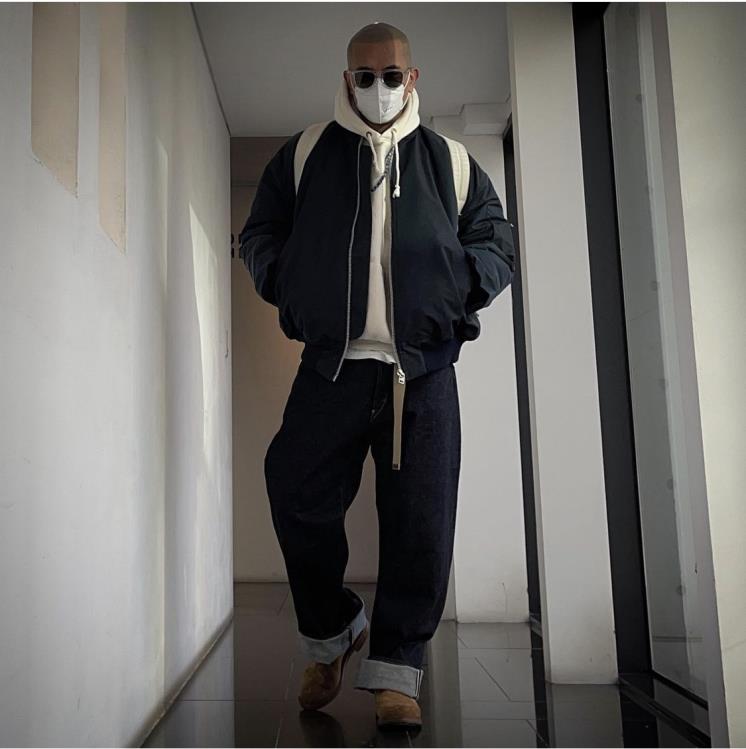 봄버 재킷을 자주 입는 그. 주로 카고팬츠나 생지데님과 함께 매치해 워크웨어룩을 연출하네요.