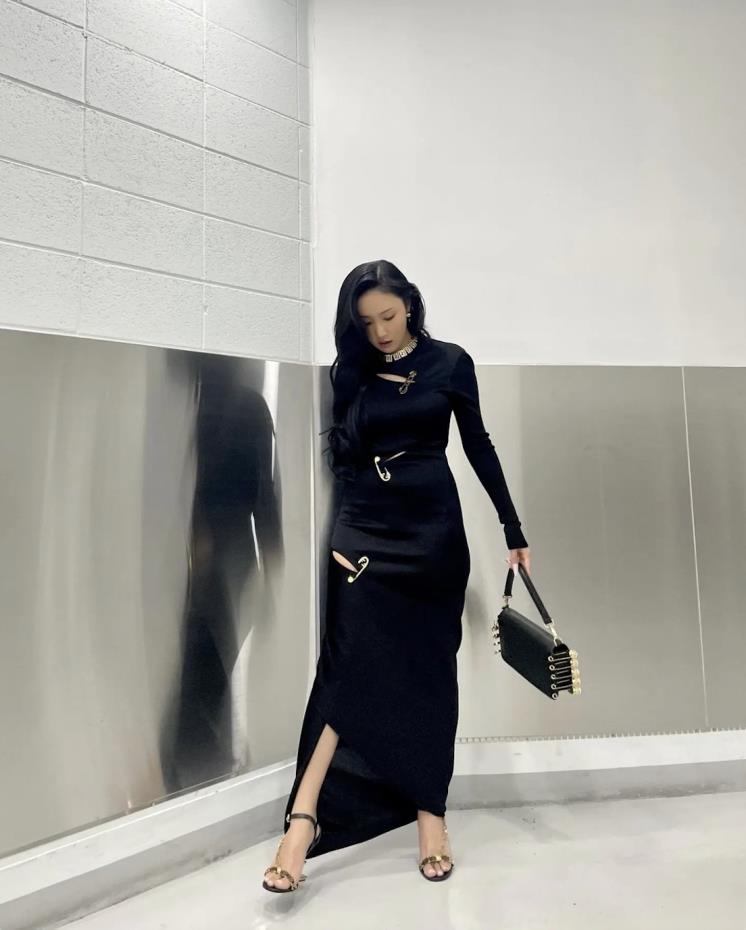 트렌드세터 화사 또한 컷아웃을 지나치지 못했다! 화사는 블랙 롱 드레스에 중간 중간 옷핀 디테일과 함께 컷아웃이 들어간 드레스를 픽. 스킨을 거의 가리는 기장의 드레스다보니 컷아웃 디테일이 더욱 돋보인다.