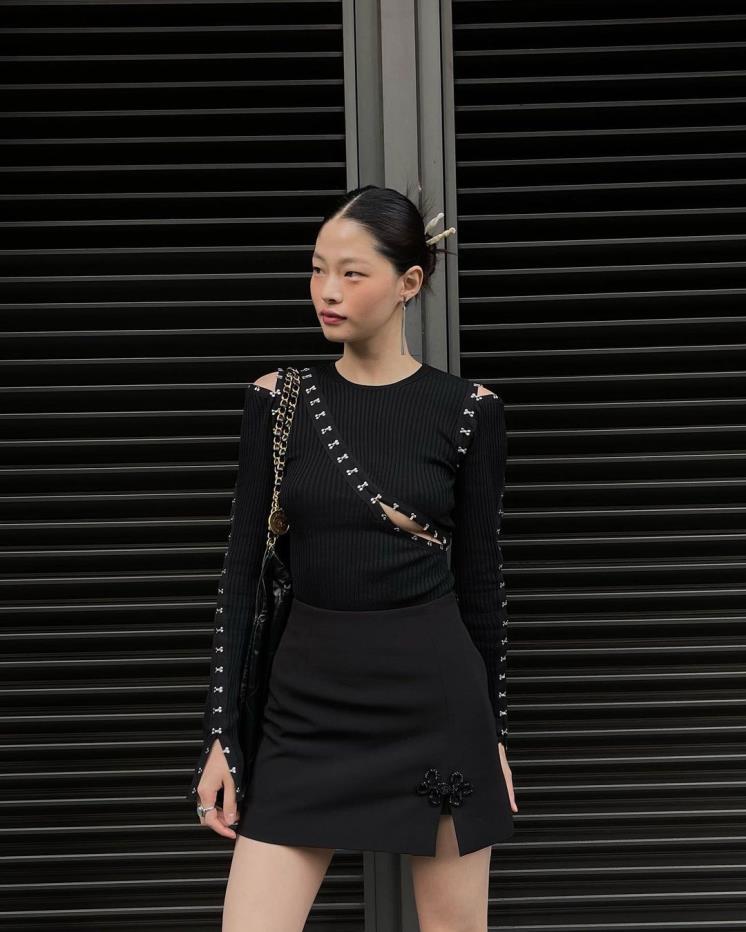 김아현은 올블랙의 어깨, 언더붑 위치에 컷아웃&훅앤아이 디테일이 있는 니트 톱을 착용했다. 여기에 앞쪽에 트임이 있는 미니스커트를 더해 머리부터 발끝까지 컷아웃룩 완성! 특히 요즘 트렌드로 떠오른 언더붑 스타일까지 두 마리 토끼를 한 번에 잡았다.