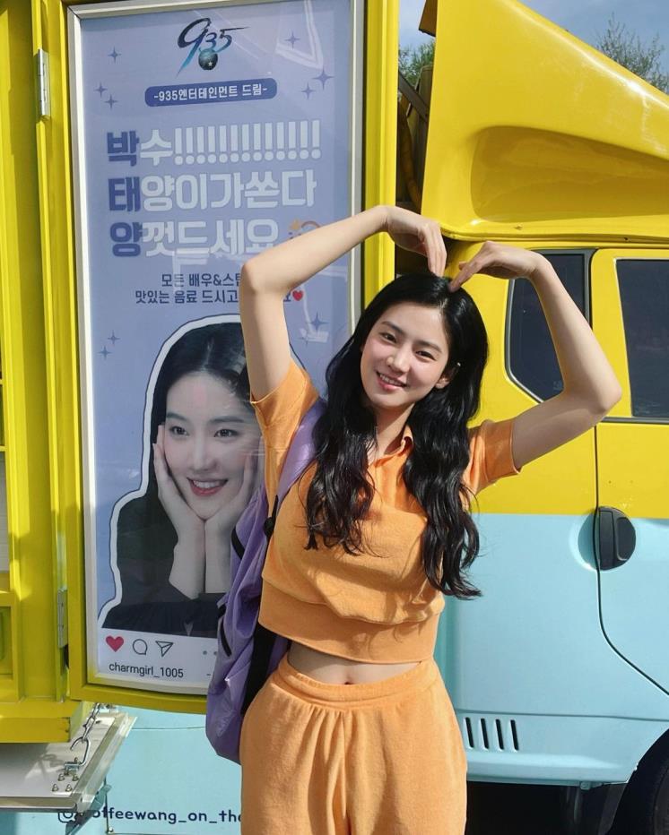 박주현은 통통 튀는 오렌지 컬러의 테리셋업을 선택했다. 활동이 많은 여름에 입으면 좋을 스타일! 여기에 연보라 백팩을 스타일링해 인간 캔디 패션 완성. 오렌지와 옐로우, 보라 컬러의 조합은 은근 잘 어울리니 도전해볼 것.
