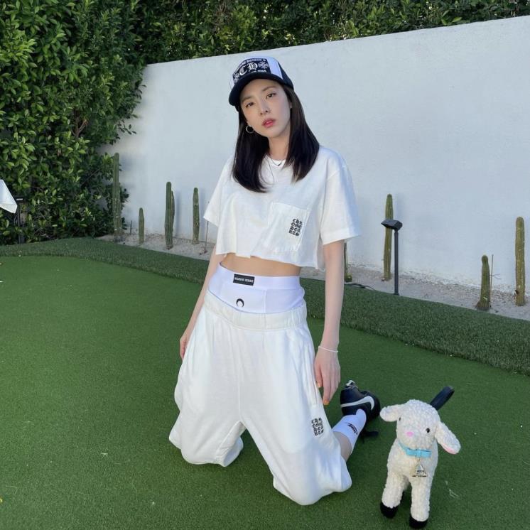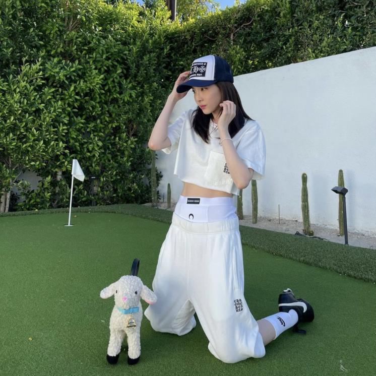 올 화이트 애슬레저룩에 마린세르의 이너웨어를 받쳐입은 산다라박.