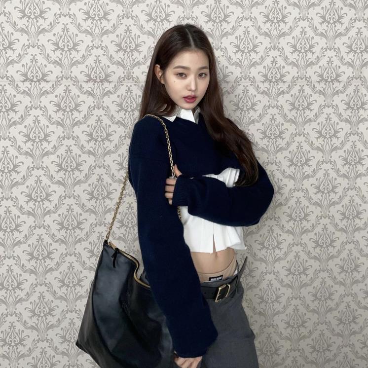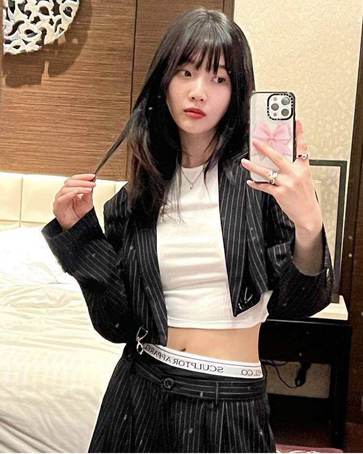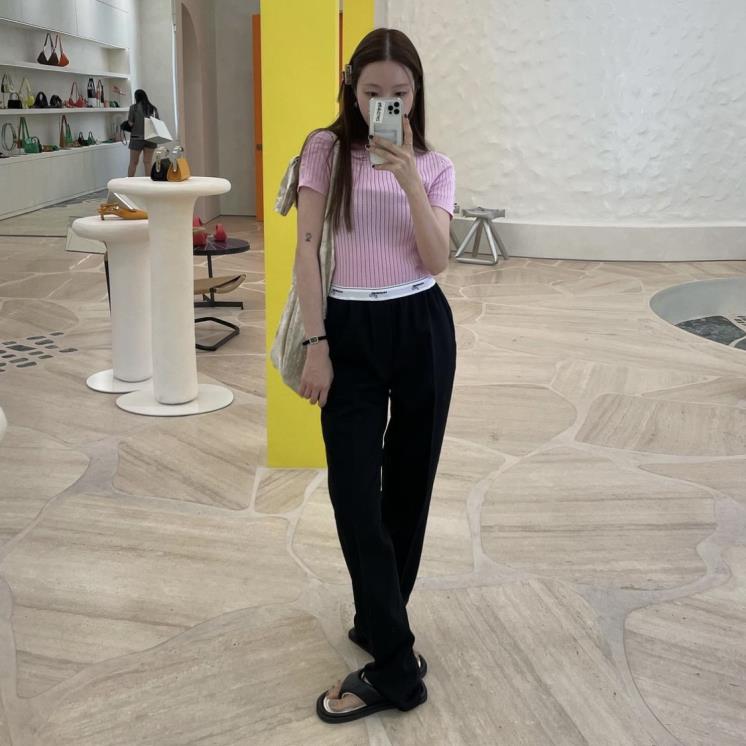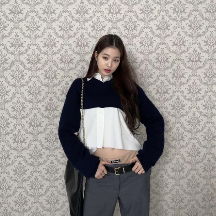 로우라이즈 패션의 선두주자 미우미우의 팬츠를 입은 장원영.