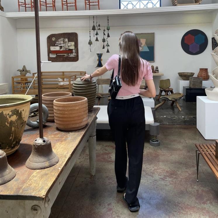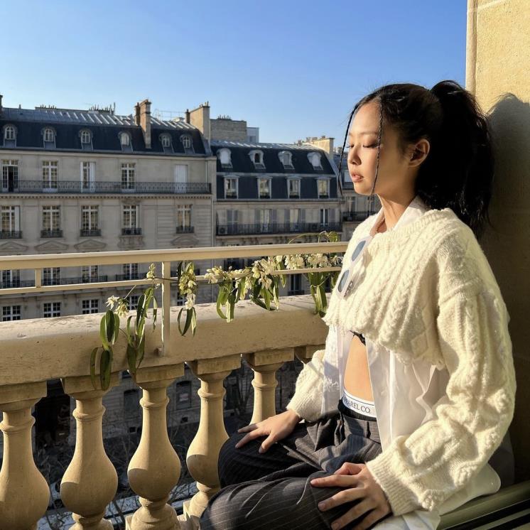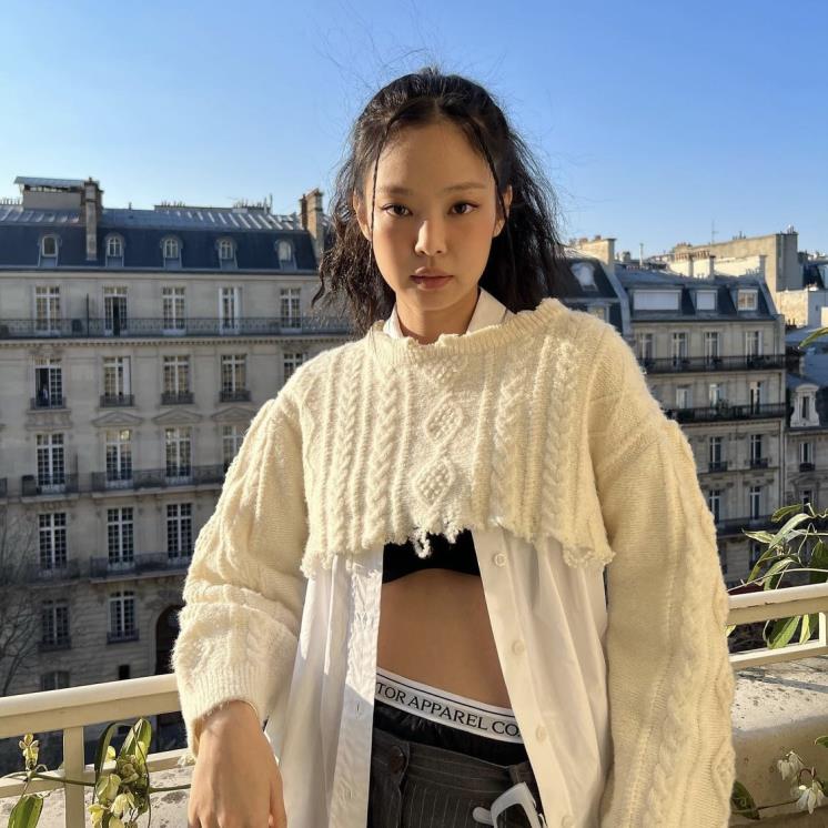 스트라이프 수트 팬츠에 스컬프터 이너. 그리고 탑으로는 셔츠와 니트를 레이어드한 제니.